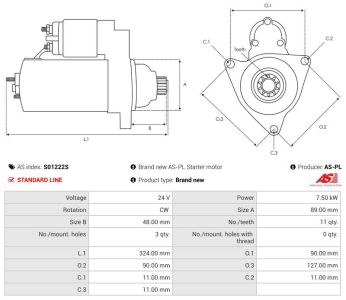 A: 89.00 mm B: 48.00 mm C.1: 11.00 mm C.2: 11.00 mm C.3: 11.00 mm L.1: 324.00 mm Fogak száma: 11 Pajzsban lévő furatok száma: 3 Menetes furatok száma: 0 O.1: 90.00 mm O.2: 90.00 mm O.3: 127.00 mm Teljesitmeny: 7.50 kW Forgás: CW Volt: 24 v