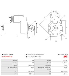 A: 68.00 mm B: 21.00 mm C.1: 8.50 mm C.2: 8.50 mm L.1: 209.00 mm Fogak száma: 9 Pajzsban lévő furatok száma: 2 Menetes furatok száma: 0 O.1: 105.00 mm Teljesitmeny: 1.10 kW Forgás: CW Volt: 12 v